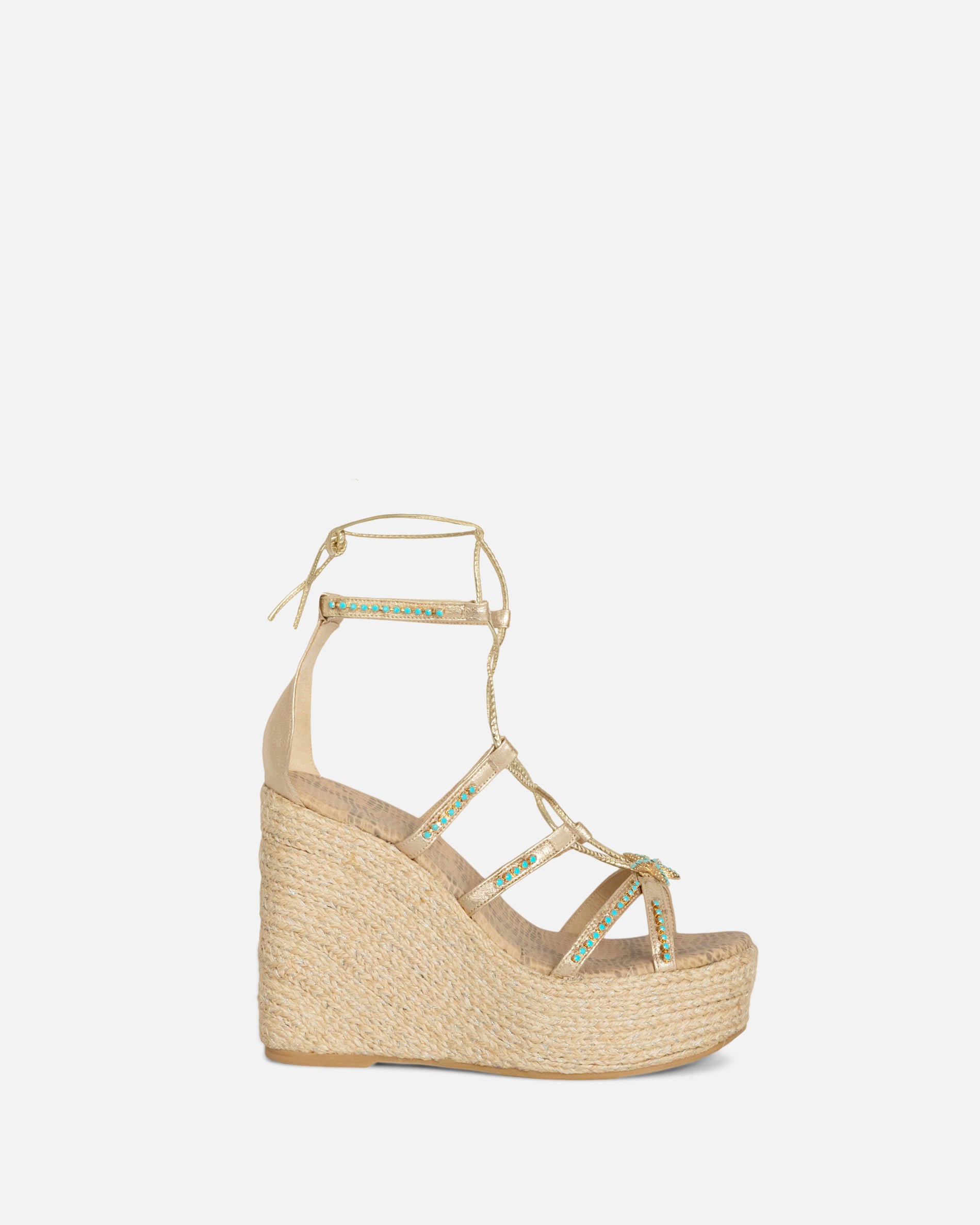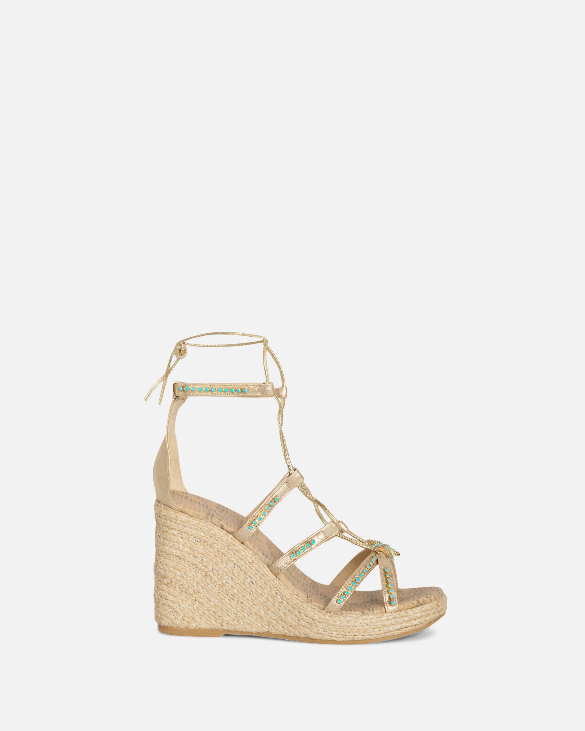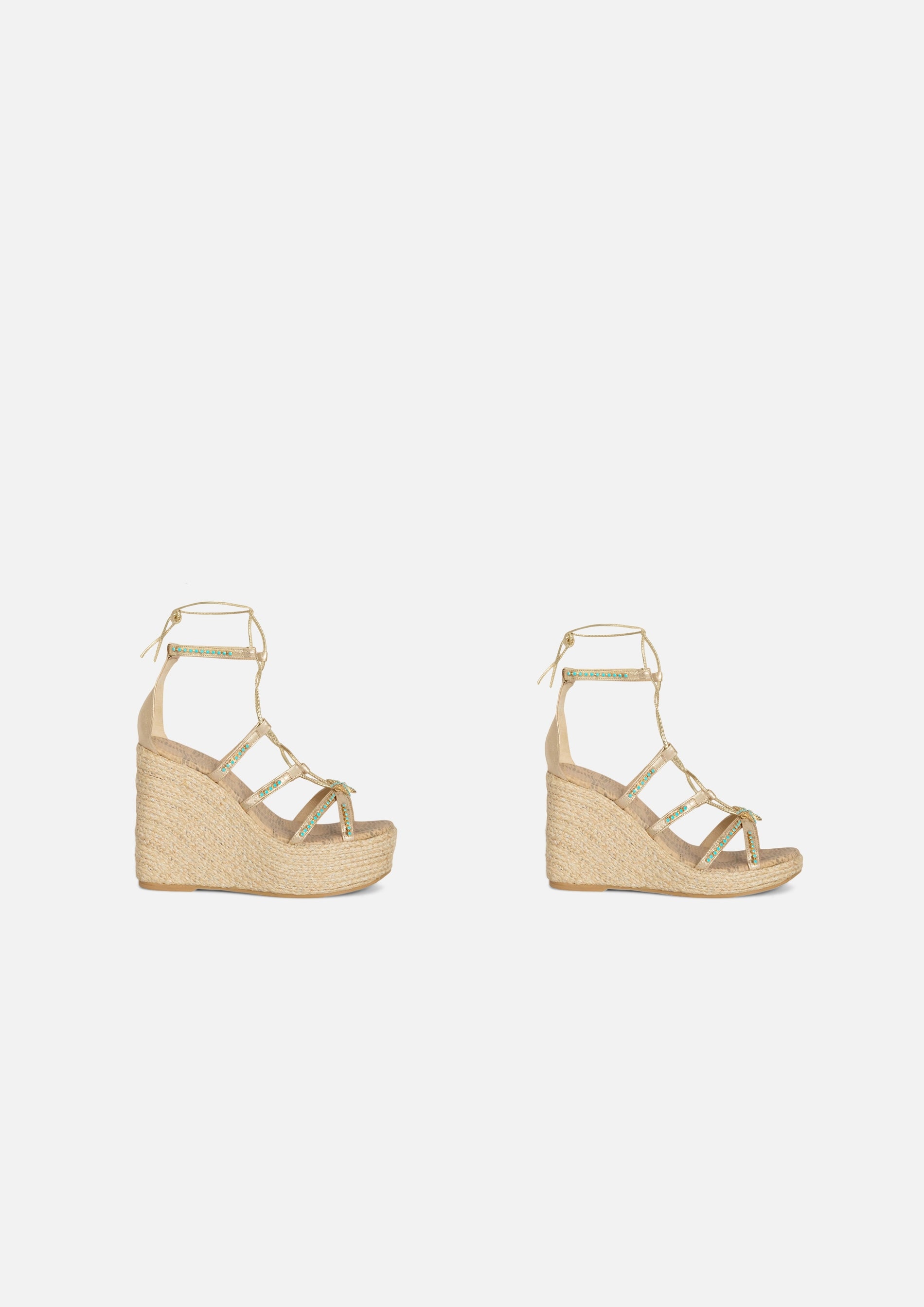 Montada sobre cuña de corcho natural ultraligero. Forrada con trenzas de yute natural con hilo lurex y suela de goma antideslizante.