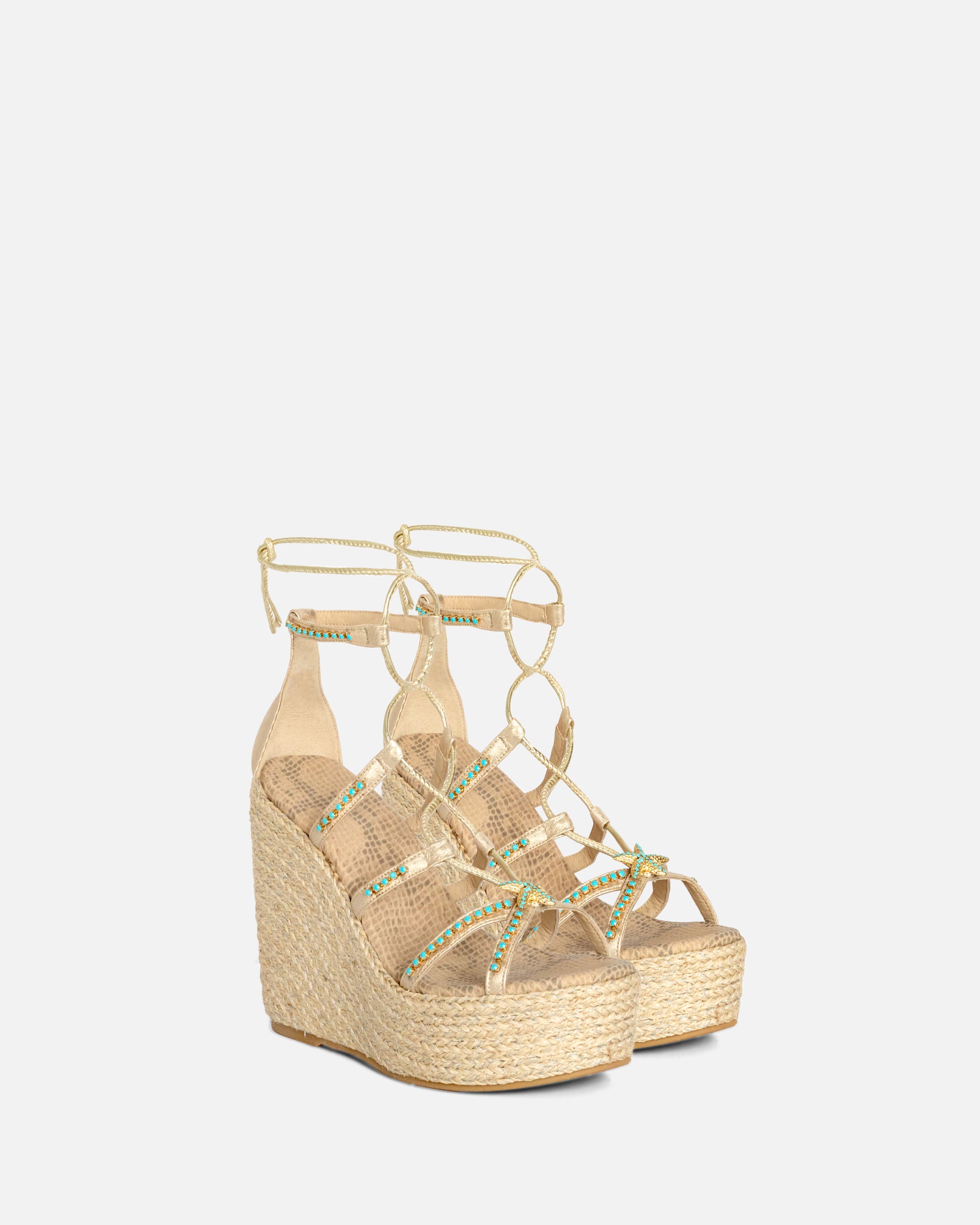 Sandalia romana de tiras y cordón en piel. Adorno de cadena y estrella de mar en zamack con baño antialérgico y piedras de cristal turquesas.