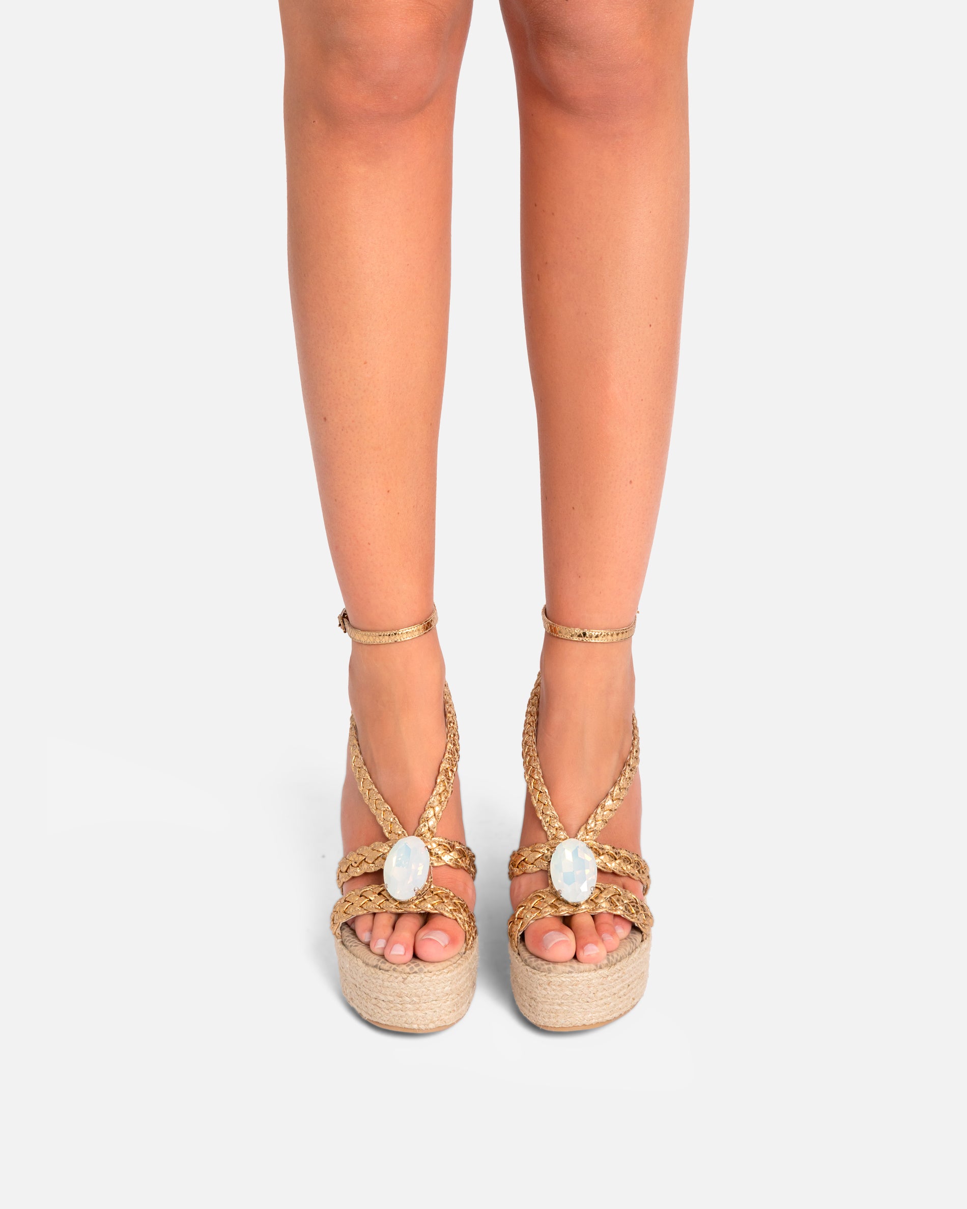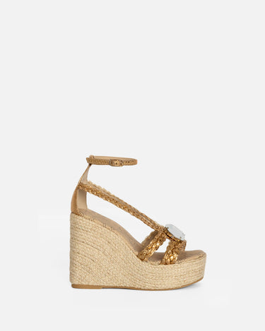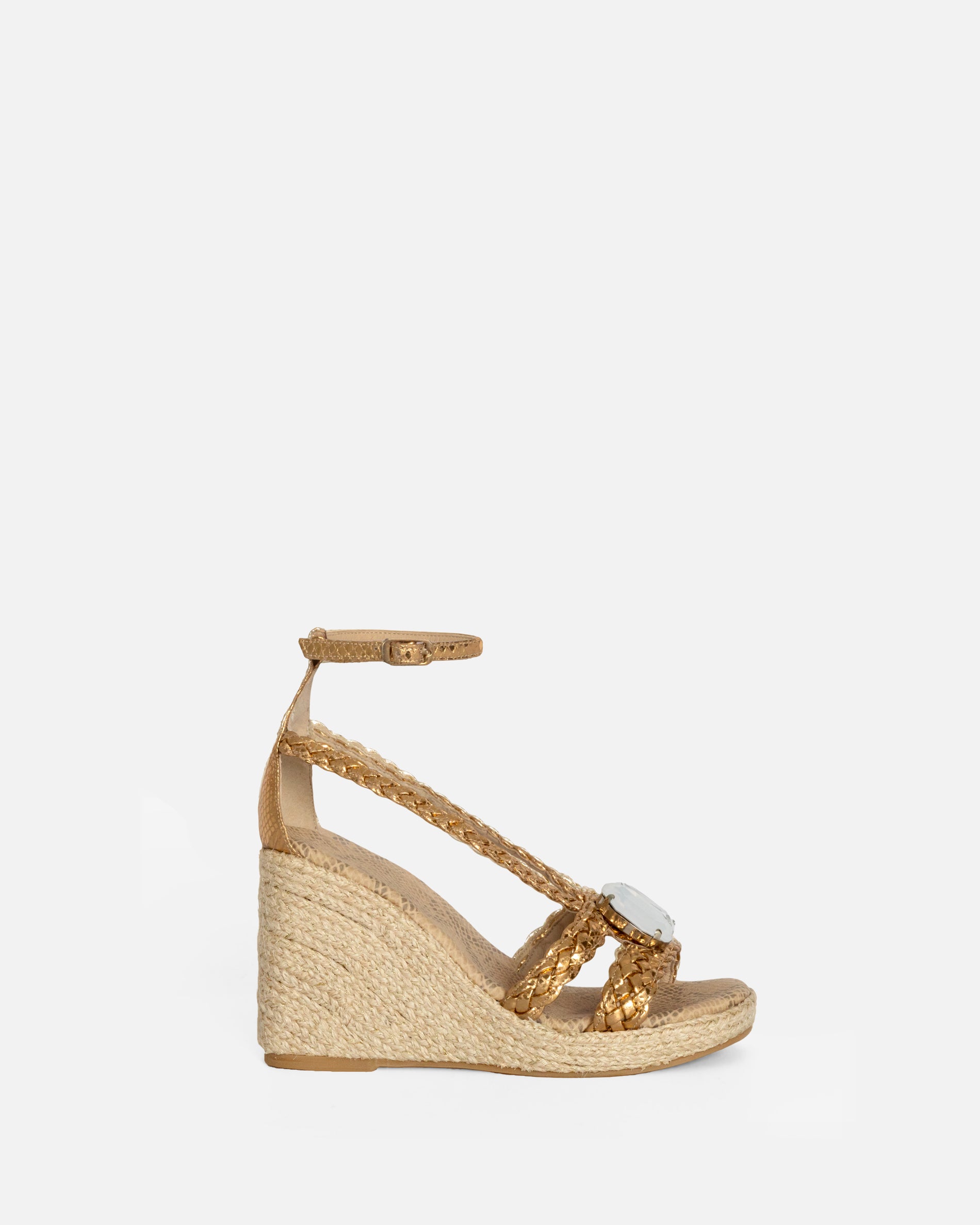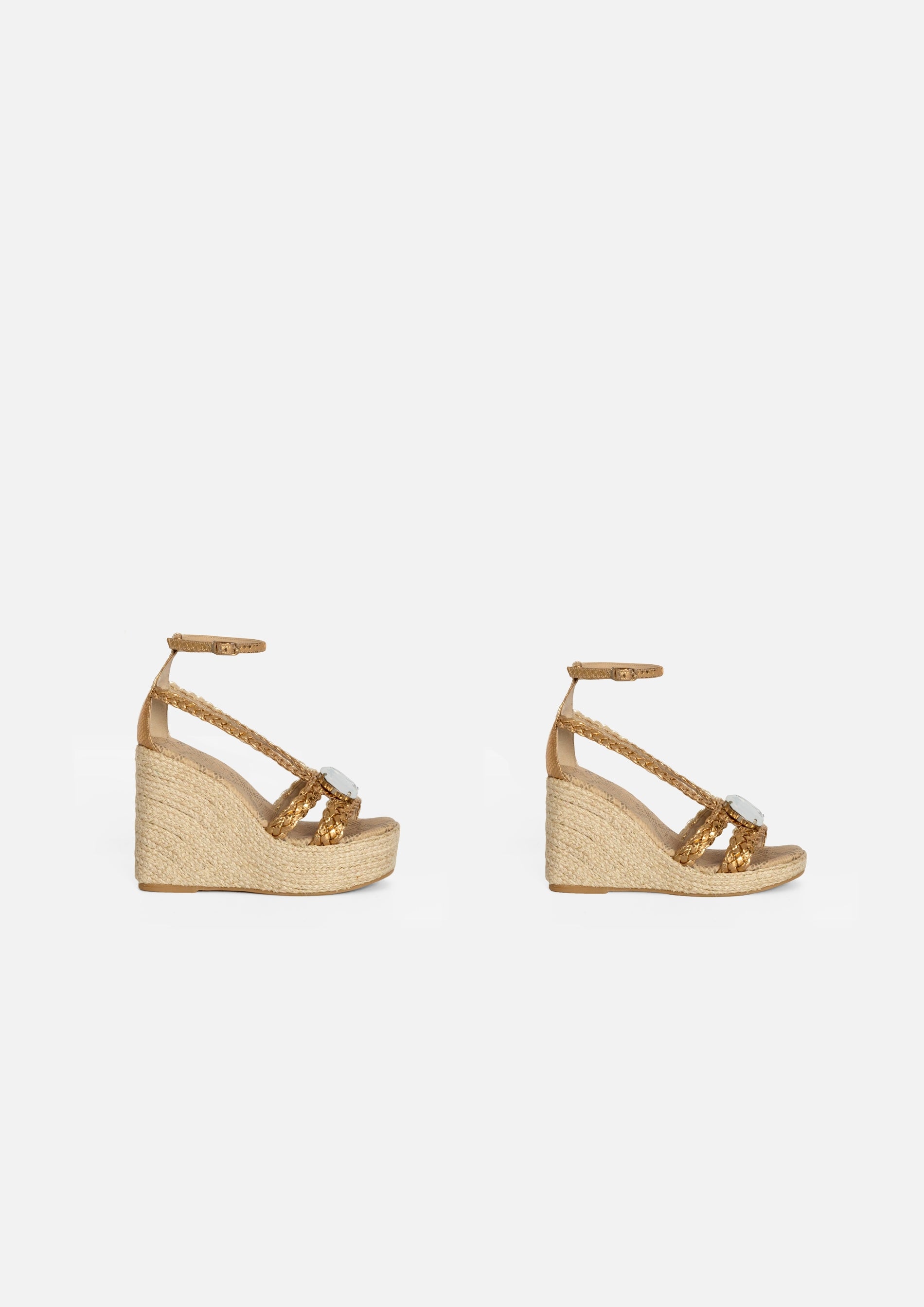 Montada sobre cuña de corcho natural ultraligero. Forrada con trenzas de yute natural con hilo lurex y suela de goma antideslizante.
